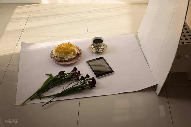 By uniknąć cieni na zdjęciach, naprzeciw okna ustawcie blendę. Nie musi to być taka profesjonalna ze sklepu foto, ja pomalowałam większy kawałek tektury białą farbą i świetnie zdaje egzamin. Na prawdę nie musimy wydawać fortuny na foto gadżety.